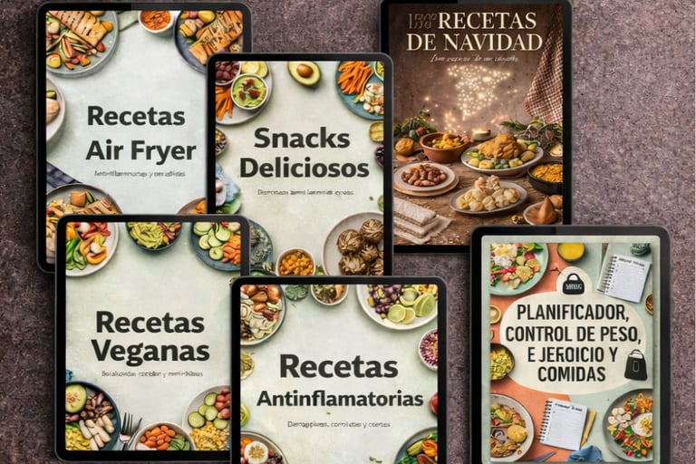Incluye recetas antiinflamatorias organizadas por categorías: desayunos, comidas, cenas, snacks, postres, batidos y versiones especiales (Air Fryer y veganas).